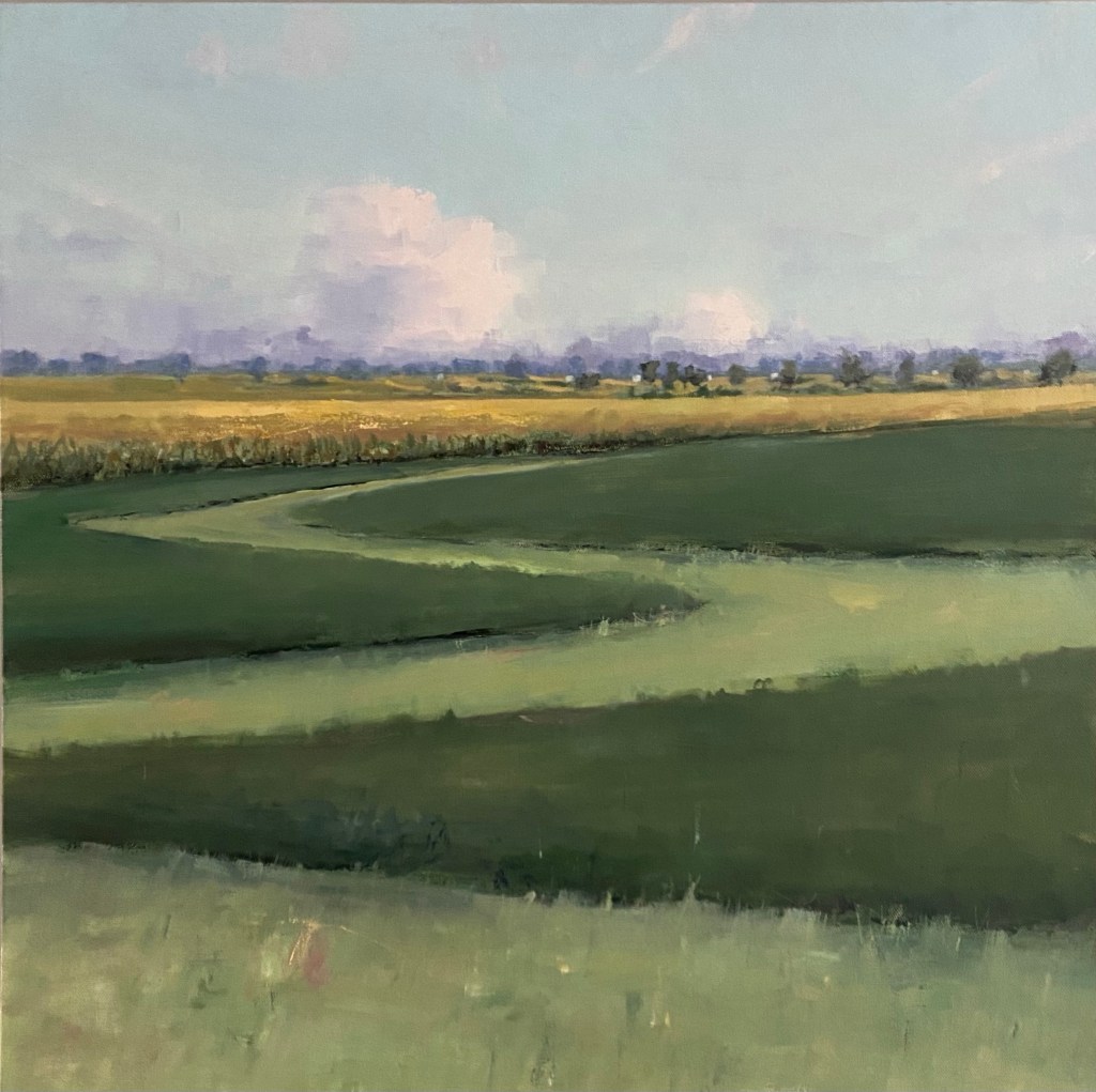 I’ve been driving around the surrounding farmlands this summer and fall, taking photos of future paintings. I just got around to facing, and finishing this one, after starting it a month ago, and being intimidated by the light in it.